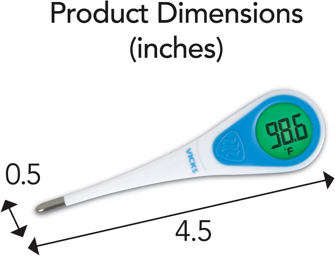 Get temperature results quickly and easily, when you need them most. The Vicks Speed Read Digital Thermometer (V912US) provides accurate readings within +/- 0.2 degrees F in only 8 seconds. The unique Fever InSight helps you get temperature readings at a glance with a color coded display, and understand them easily. A green display suggests a normal temperature, yellow signifies an elevated temperature and a red display indicates a high temperature Because it can be used as an adult thermometer for oral readings as well as be used a rectal thermometer for babies or even used under the arm for toddlers and kids, it’s perfect for the whole family. It also has a memory feature that recalls and displays last temperature taken, an automatic shut-off for longer battery life and is waterproof for easy, thorough cleaning. Plus, this temp thermometer includes a storage case, battery and has a limited 1 year warranty.