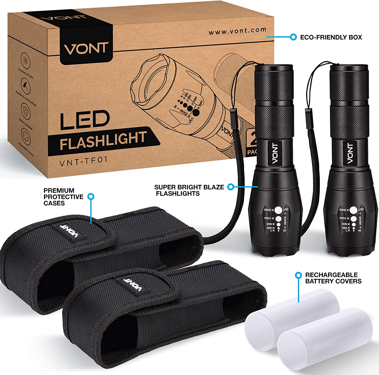 Vont LED Tactical Flashlight, [2 Pack] 2X Longer Battery Life, 5 Modes, High Lumen, Adjustable, Zoomable,Waterproof, Lightweight,Bright Flashlights/Flash Light Gear/Accessories/Supplies for Camping