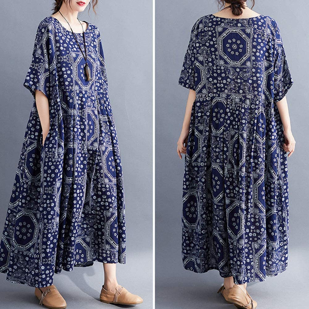 Women Loose Cotton Linen Dress Mixed Print Boho Maxi Swing House Dress with Pockets