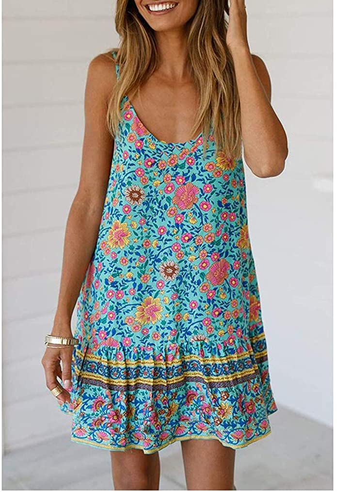 Womens Boho Floral Printed Dress Summer Sleeveless Adjustable Strap Beach Mini Dress with Pockets