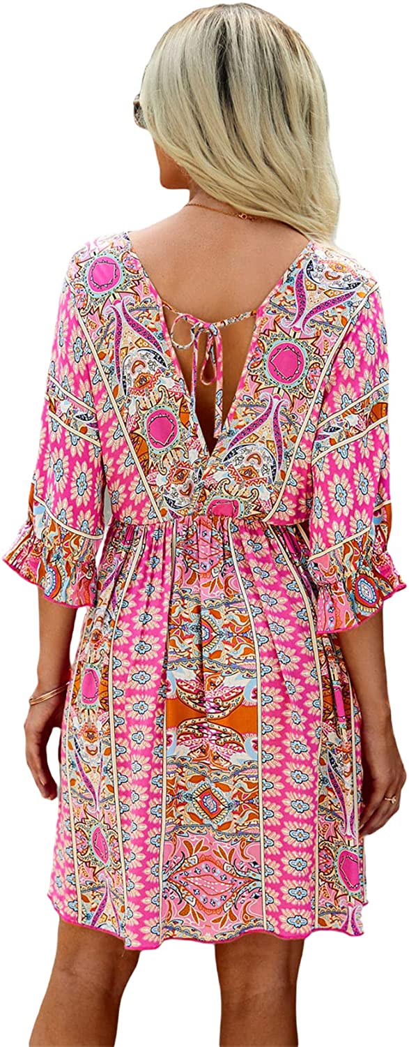 Women's Boho Tribal Print Short Sleeve V Neck Tie Back Summer Shift Dress