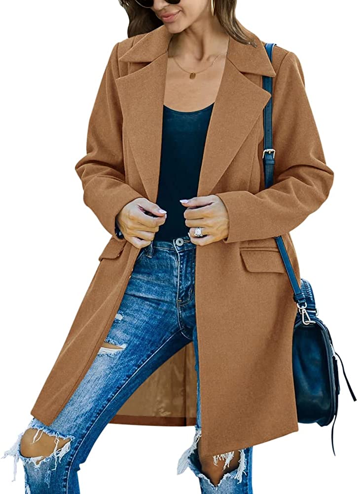 Womens Casual Long Sleeve Wool Blend Pea Coat Lapel Notched Collar Warm Midi Jacket Overcoat