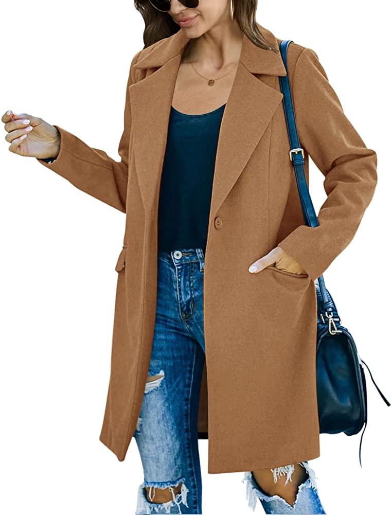Womens Casual Long Sleeve Wool Blend Pea Coat Lapel Notched Collar Warm Midi Jacket Overcoat