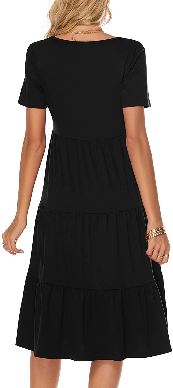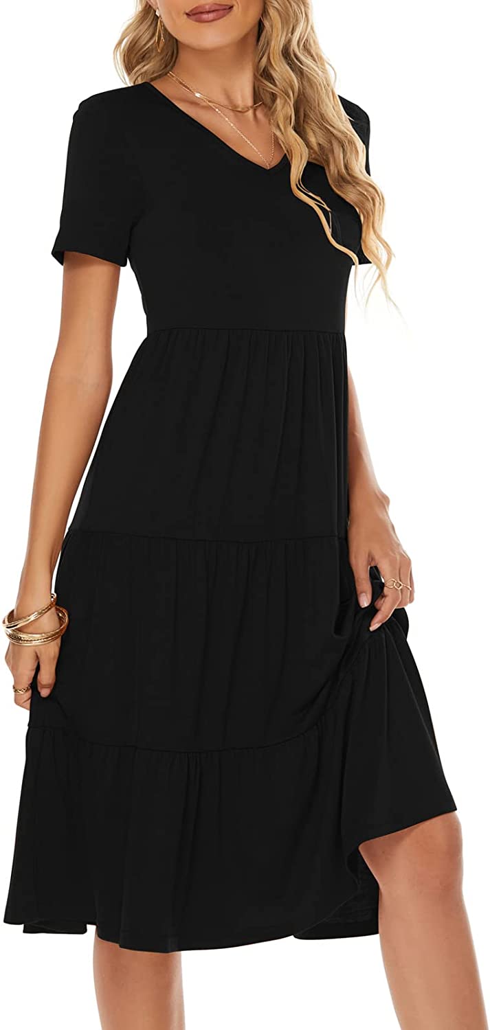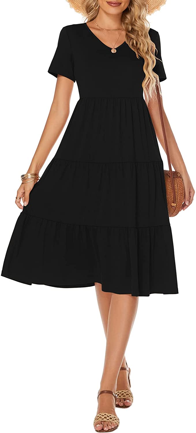 Women's Casual Summer Tiered Midi Dress Short Sleeve V-Neck Loose Cotton Ruffle Babydoll Dress Boho Sundress
