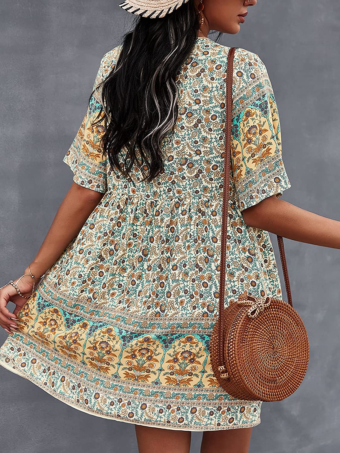 Women's Dress Bohemian Summer Floral Printed Button Down Mini V Neck Short Sleeve Casual Dresses with Pockets