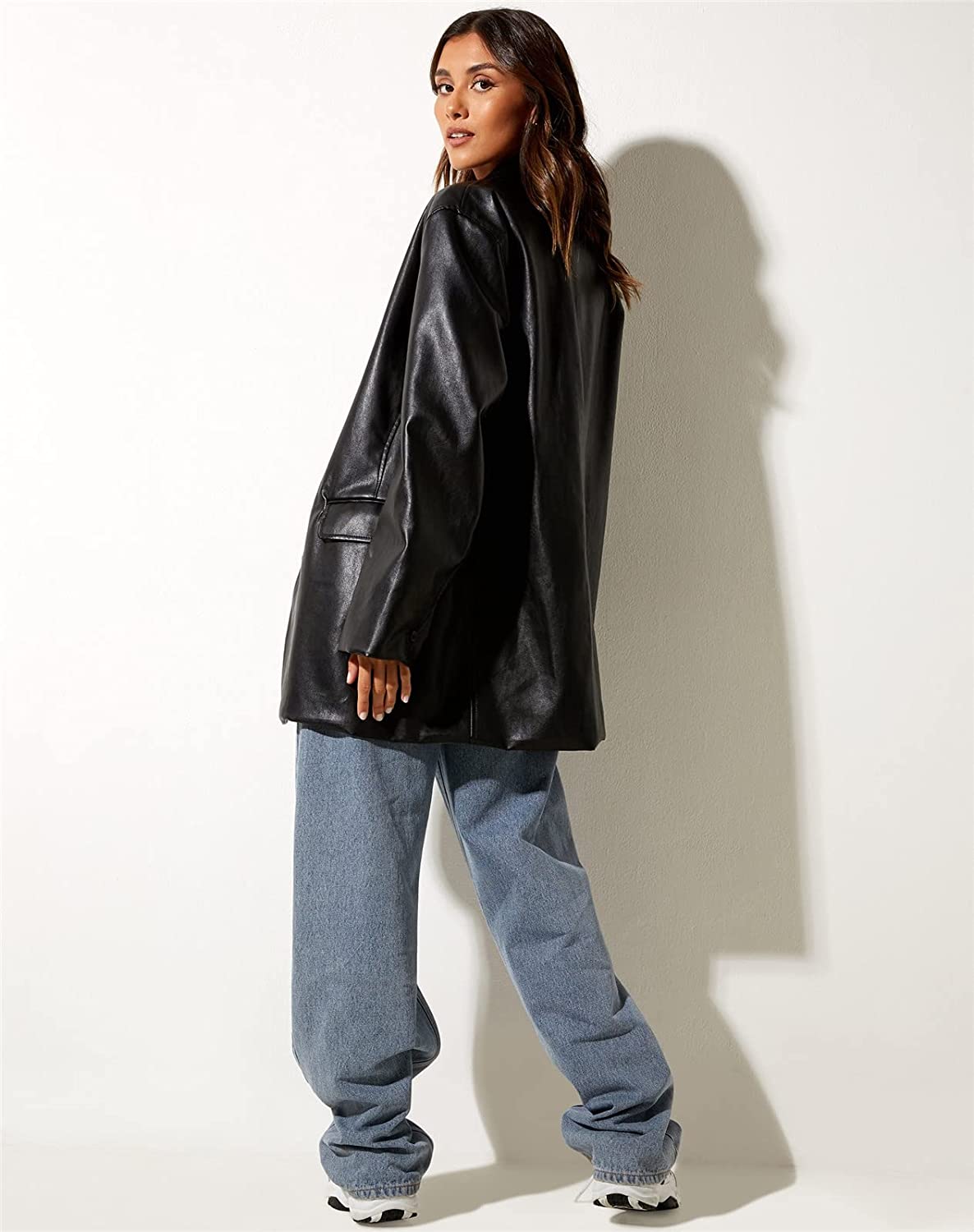 Womens Leather Blazer Coat, Long Sleeve Lapel Faux PU Leather Jacket Button Front Trench Coat