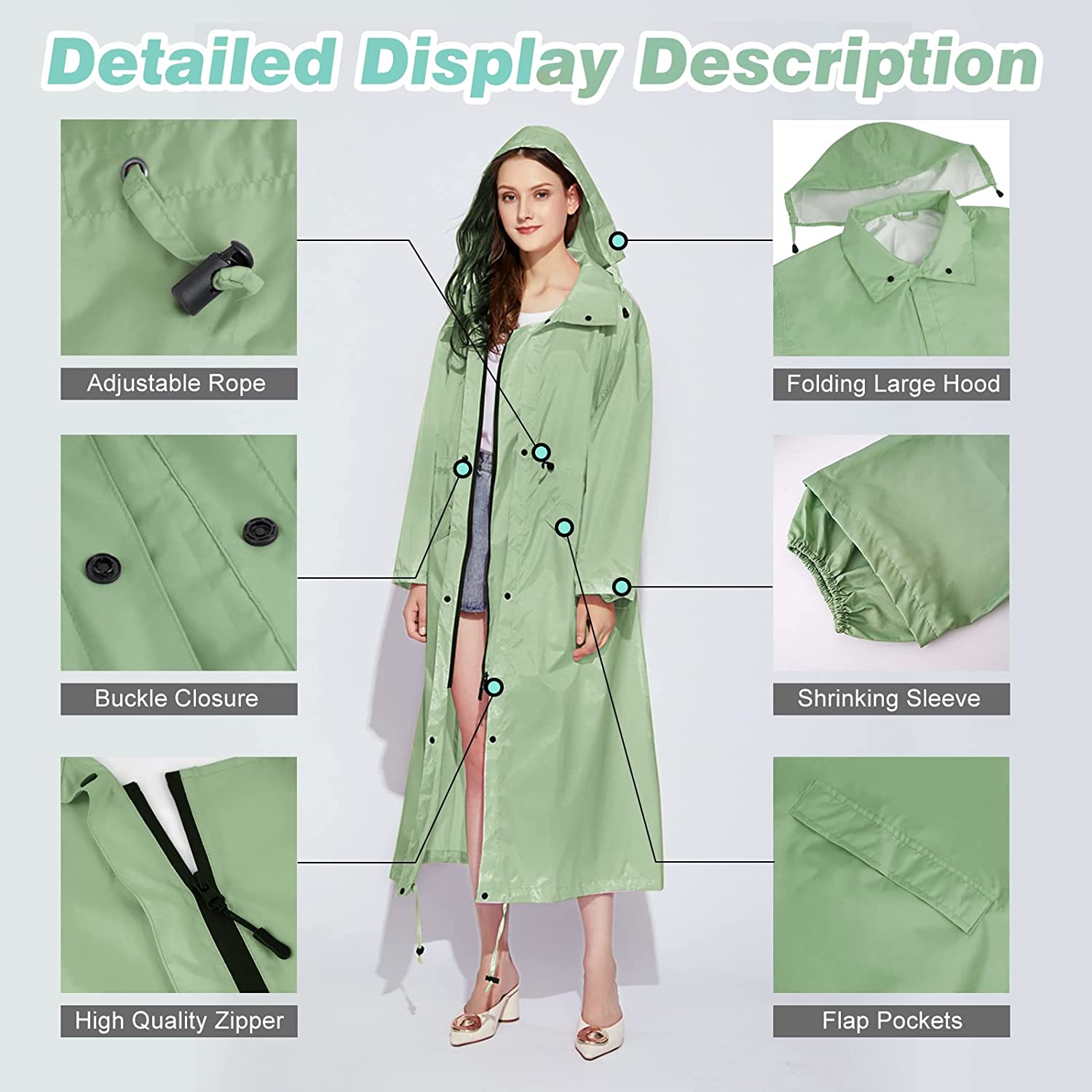 Womens Long Raincoats Rain Jacket Waterproof Packable Outdoor Hooded Windbreaker Lightweight Adjustable Waist for Outdoors