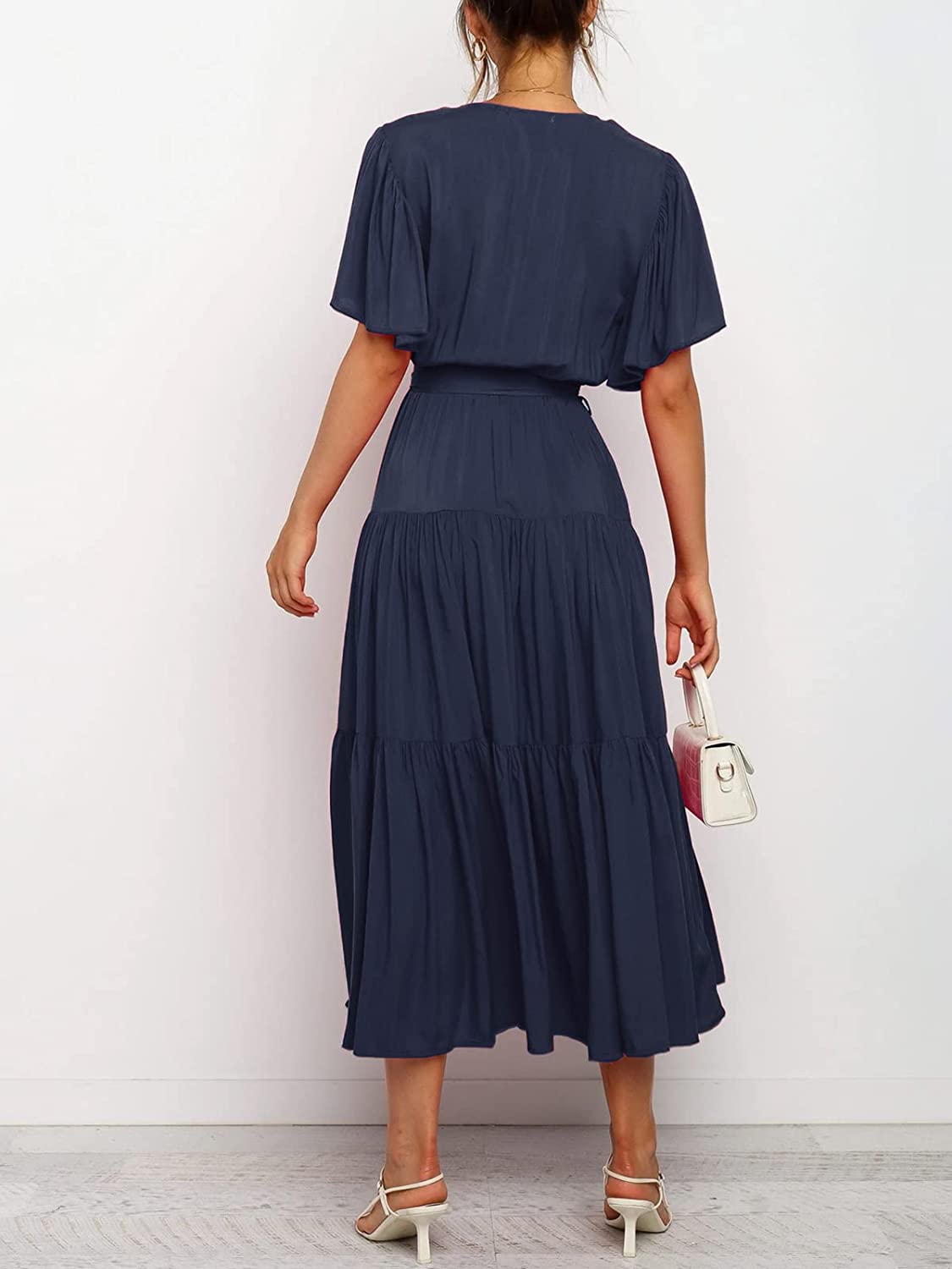 Women's Maxi Dress Summer Short Sleeve Chiffon Dresses Casual V Neck Tie Waist Formal Dress