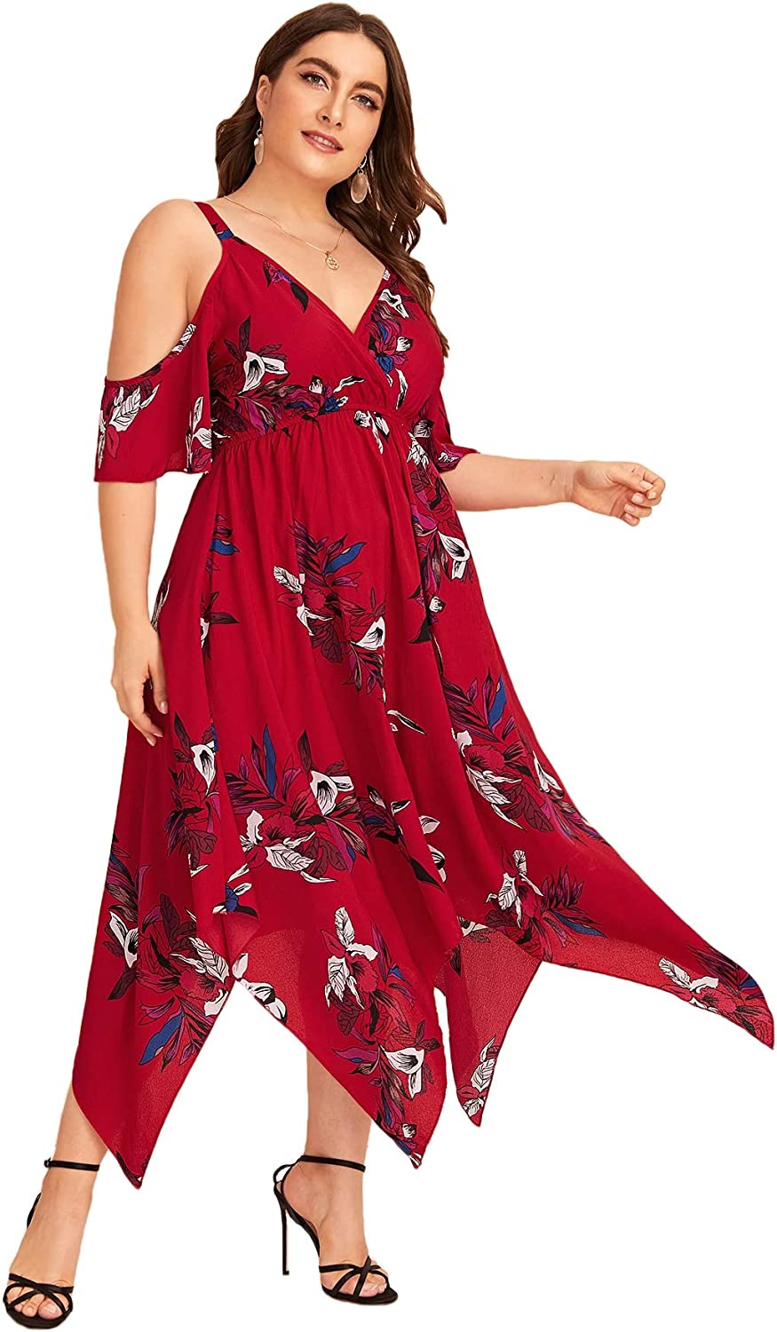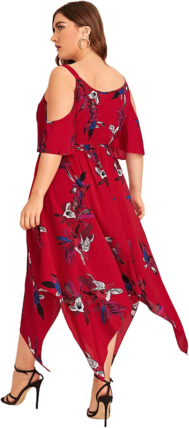 Women's Plus Size Cold Shoulder Tropical Floral Slit Summer Maxi Dress