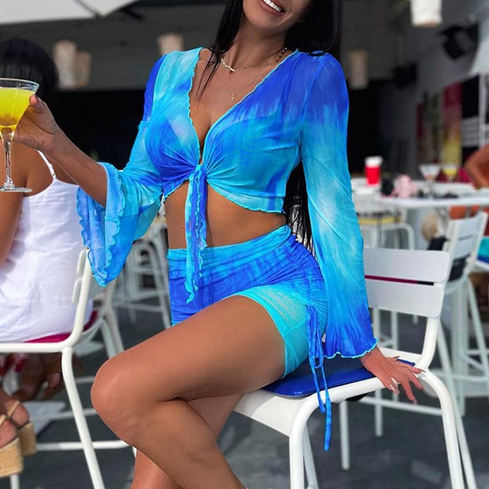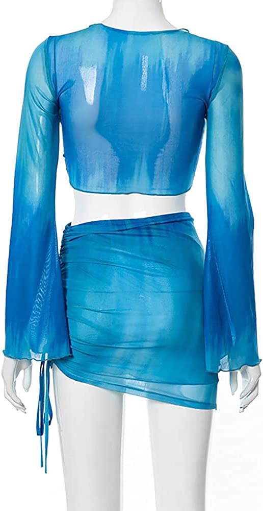Women's Sexy Long Sleeve 2 Pieces Sheer Mesh Cover Up Dress Crop Top Bodycon Ruched Y2K Mini Skirt Sets