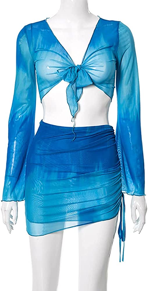 Women's Sexy Long Sleeve 2 Pieces Sheer Mesh Cover Up Dress Crop Top Bodycon Ruched Y2K Mini Skirt Sets