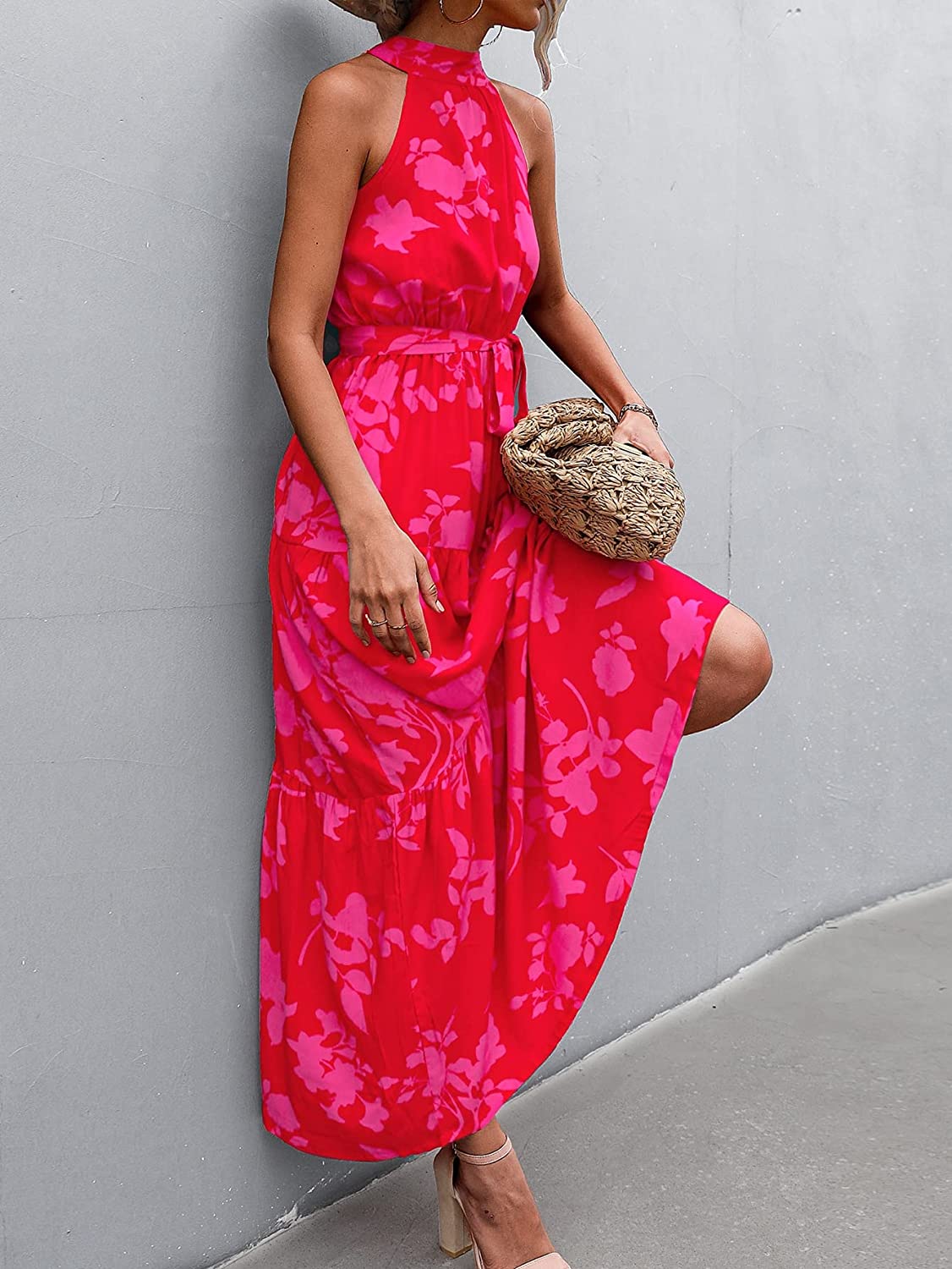 Women's Sleeveless Halter Neck Vintage Floral Print Maxi Dress