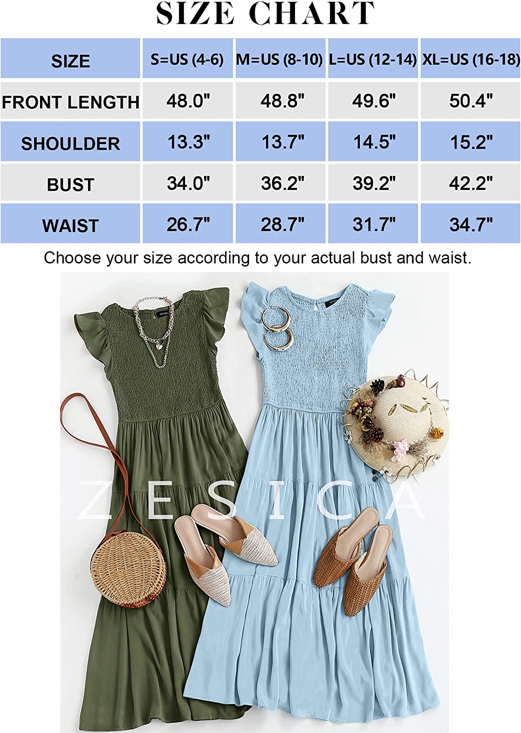 Women's Summer Casual Flutter Short Sleeve Crew Neck Smocked Elastic Waist Tiered Midi Dress