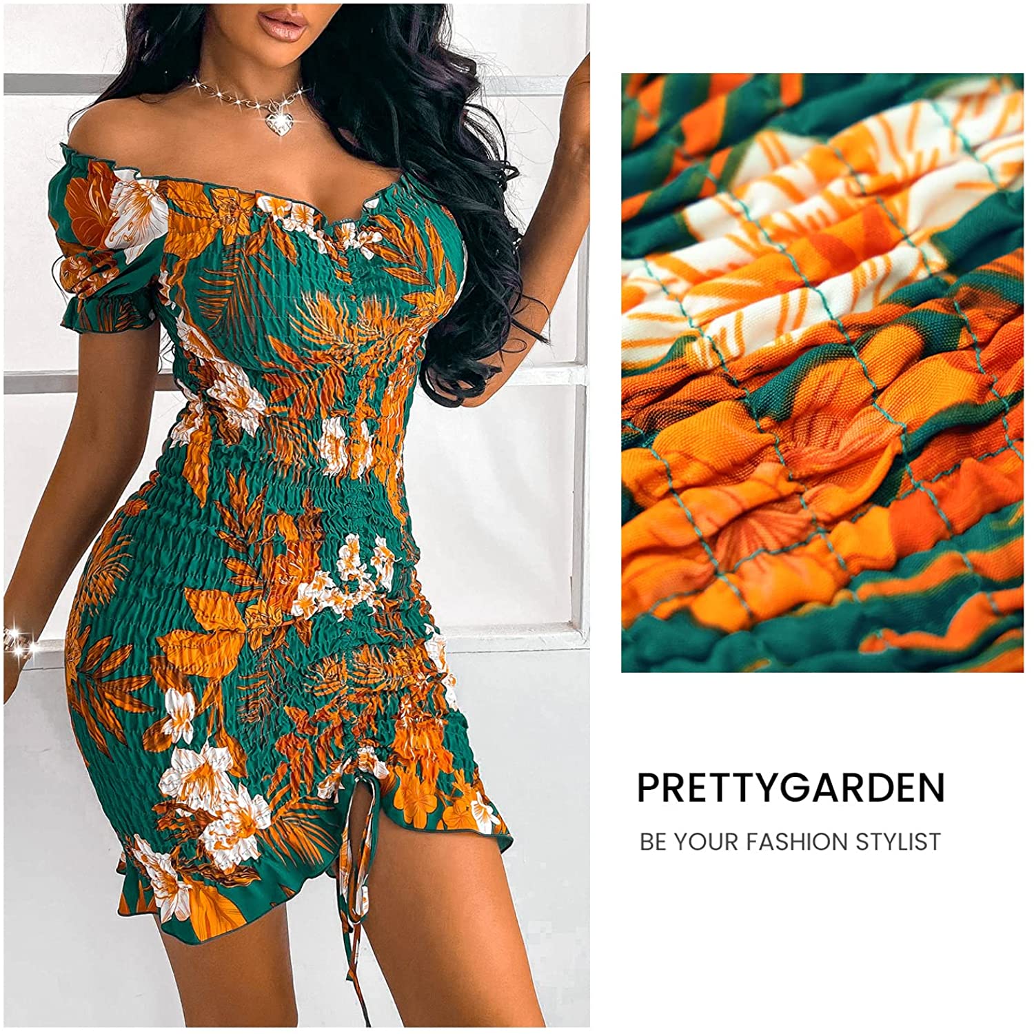 Women's Summer Off Shoulder Bodycon Dresses Short Sleeve Drawstring Sexy Mini Party Club Smocked Dress