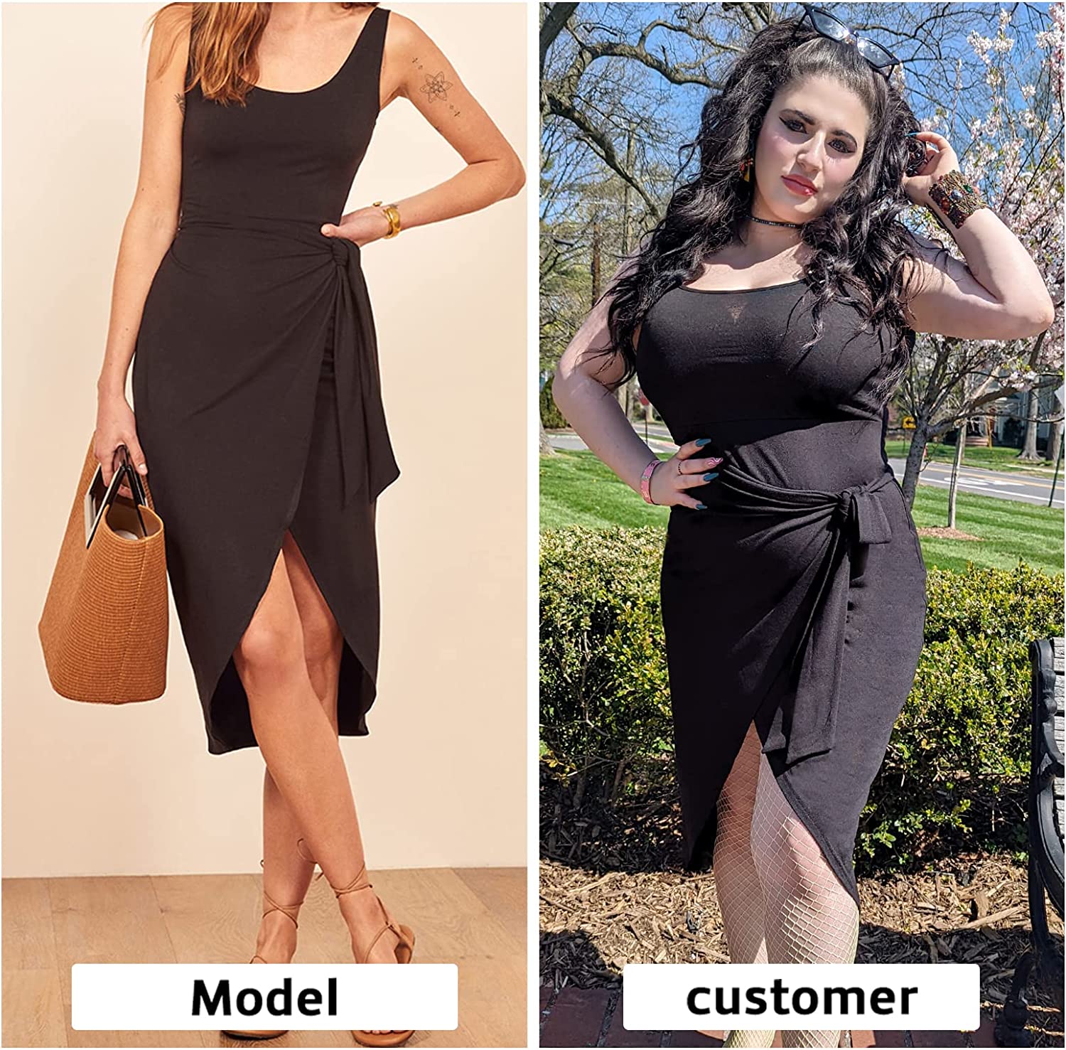 Women's Summer Sleeveless Solid Split Front Bodycon Midi Tank Dress with Belt
