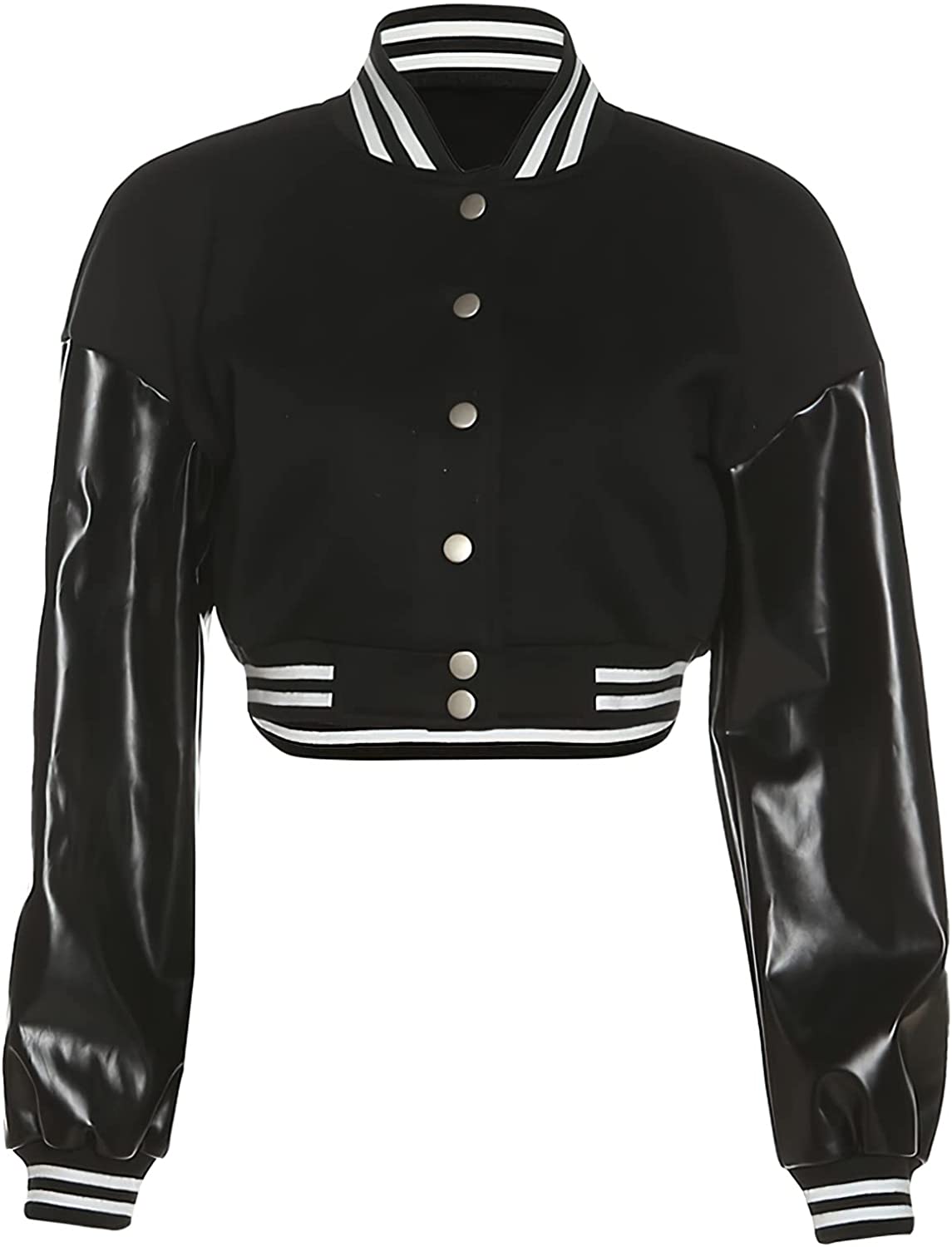 XASPEE Women's Casual Baseball Jacket Faux Leather Colorblock Button Crop Bomber Jacket