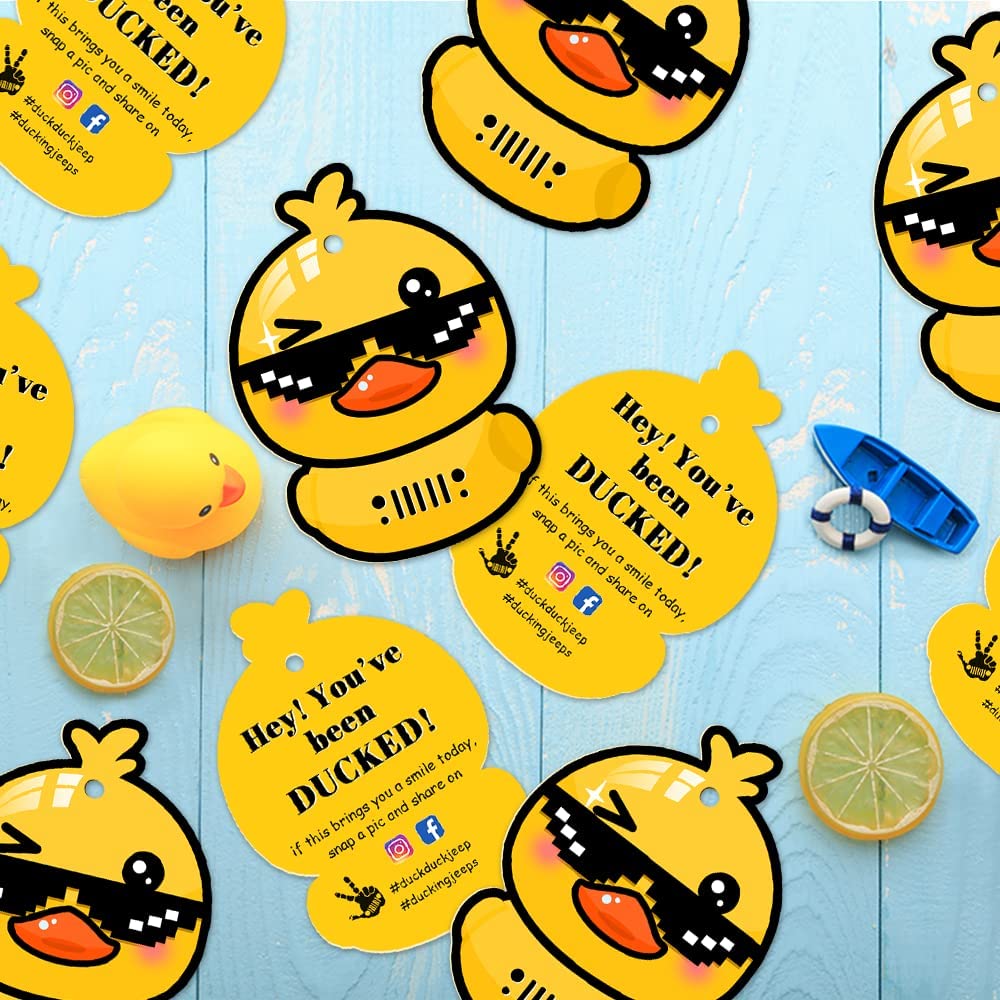 You're Been Ducked ! The cards are used to participate the duck duck jeep game. Color:As picture showsQuanitity:50 PiecesSize:2.9x 2.1inchesPackage includes: 50 x Rubber Bands 50 x Duck Duck cards